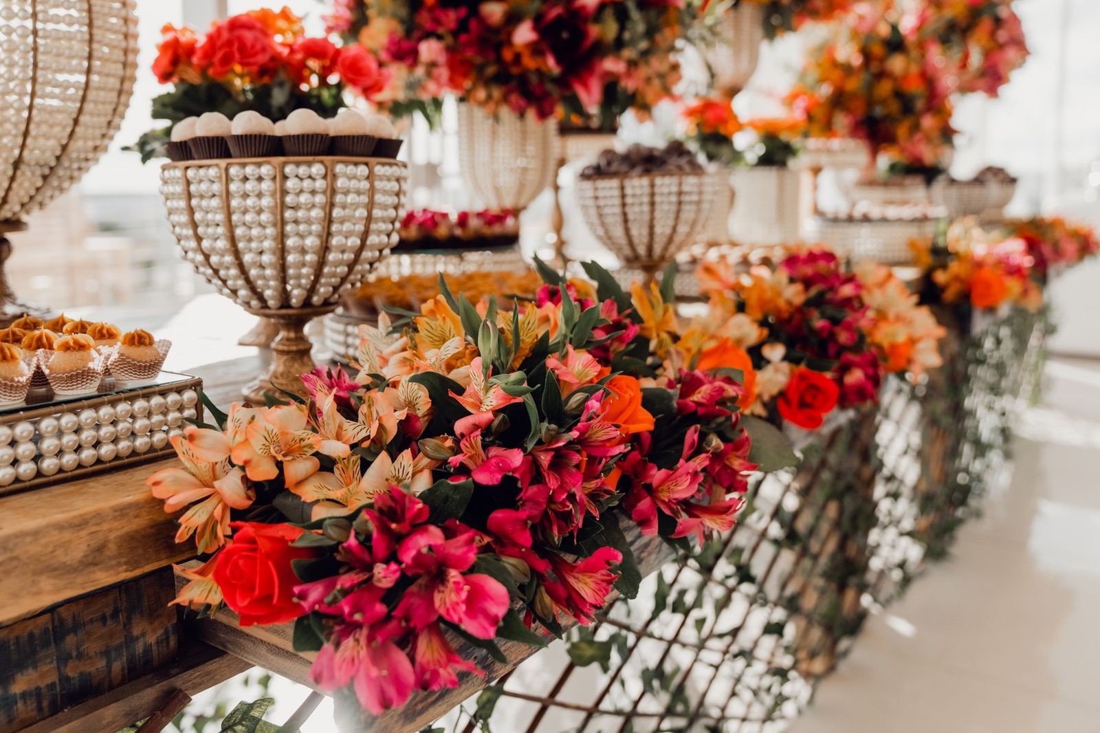 Para a mesa de doces, Dani Rizzi apostou em um mix de peças de madeira, deixando o espaço elegante. Para acomodar os doces, peças de cobre e pérola.