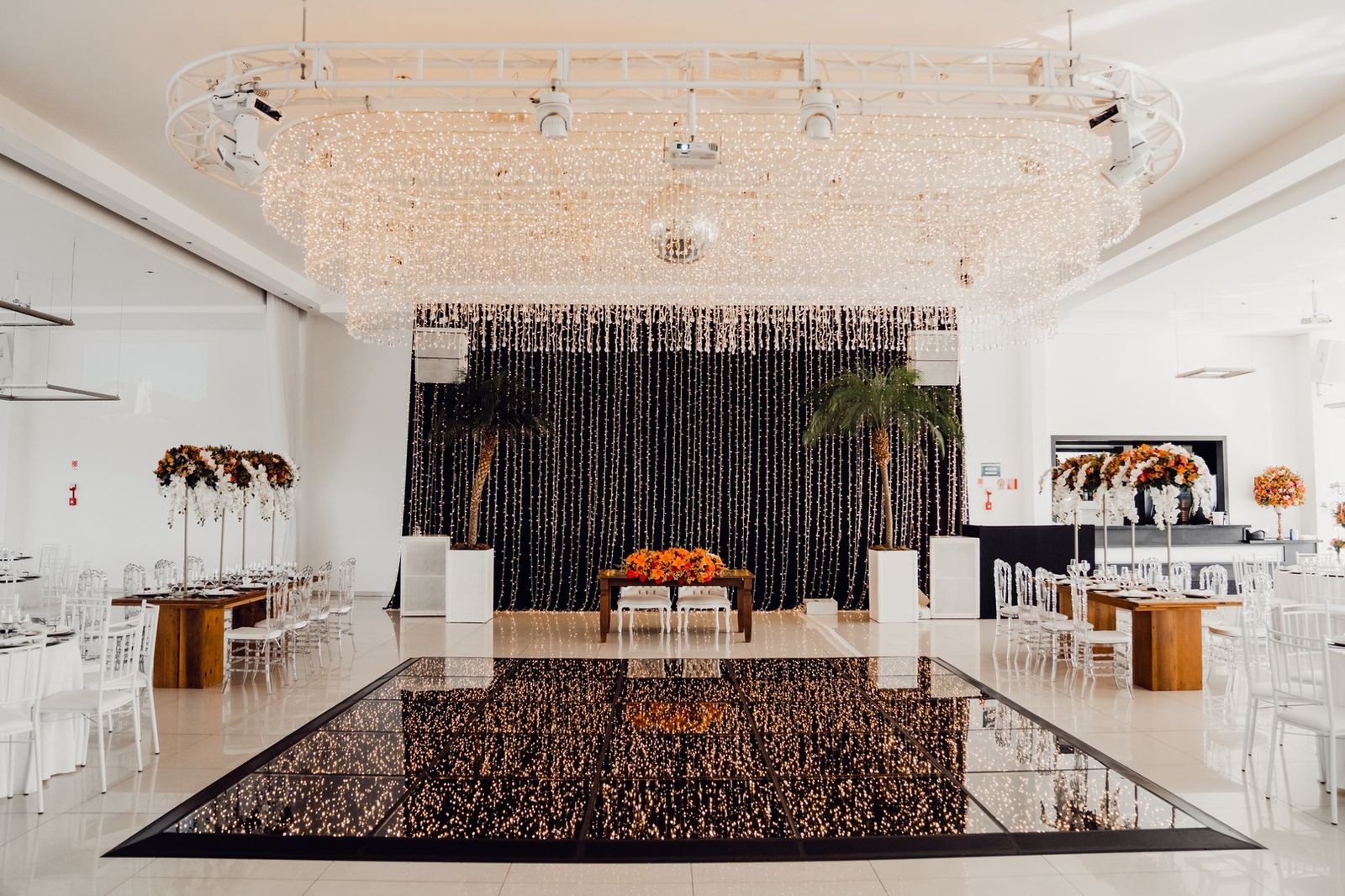 O mix de mobiliários de Cristais, candelabros e madeira deram charme e aconchego ao projeto, arrematando a decoração.